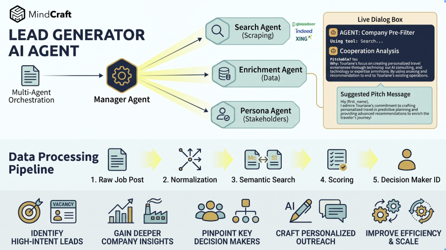 Our Lead Generator AI Agent isn’t just a wrapper around an LLM; it is a sophisticated multi-agent system designed to identify high-intent signals from the global job market and transform them into actionable sales intelligence.