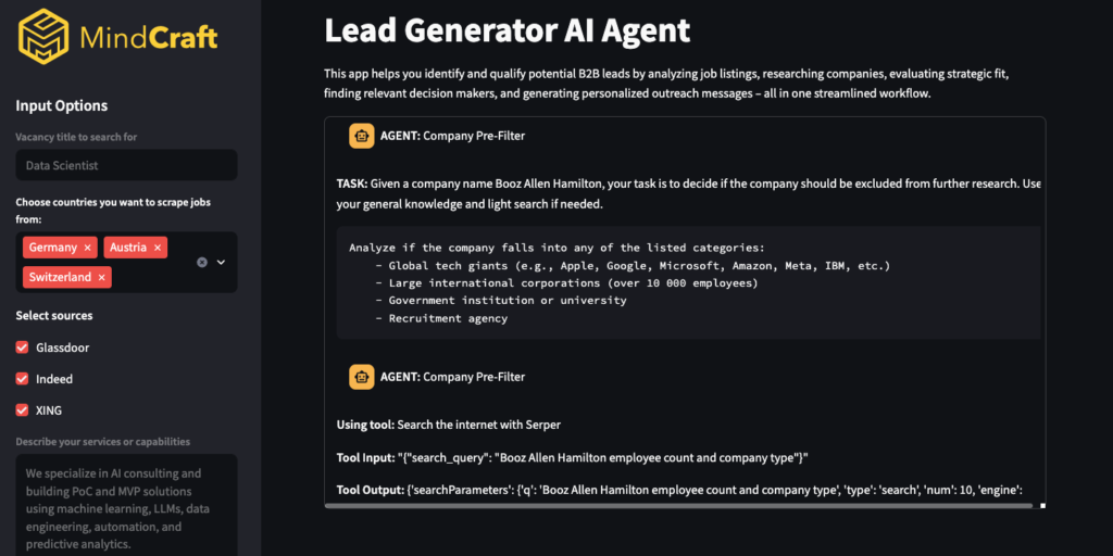 As seen in the interface above, the Company Pre-Filter Agent actively uses tools (like Serper for real-time web search) to validate if a lead fits your target criteria. For example, it can check employee counts or categories against your exclusion list in real-time, ensuring high-quality funnel entry.